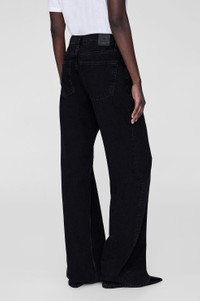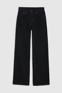 The Hugh Jean is a relaxed, '90s-inspired style constructed from midweight rigid organic cotton denim without stretch in a faded black wash with vintage-inspired grinding, hand sanding, and highs and lows throughout. - Organic cotton denim - Relaxed fit - Mid rise intended to be worn low on the hips - Button-fly closure - Wide leg - Long inseam - Clean-edge hem FIT + MEASUREMENTS Mid Rise Relaxed Wide: Take your true size. If you are in between sizes, we recommend taking one size up in this style. Model is wearing a size 24. Model Measurements: Height: 5'10.5", Bust: 31", Waist: 24", Hips: 34" Product Measurements (Size 27): Inseam: 34", Rise: 11.3", Waist: 31", Hip: 40", Leg Opening: 21" MATERIAL + CARE 80% Cotton, 20% Post-Consumer Recycled Cotton Machine wash Made in Turkey
