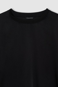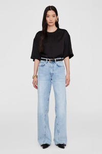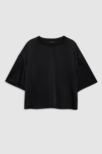 The Imogen Top is crafted from lightweight 25 mm double-faced silk charmeuse with a semi-shiny finish. Its cropped T-shirt silhouette is elevated with straddle and ladder stitch detailing at the neckline, hem, and dropped shoulder seams. The Imogen Top is cut for a cropped and boxy oversized fit with long short sleeves. Take your true size. FIT + MEASUREMENTS The Imogen Top is cut for a cropped and boxy oversized fit with long short sleeves. Take your true size. Model is wearing a size S. Model Measurements: Height: 5'9.5", Bust: 29.5", Waist: 23", Hips: 34.5" Product Measurements (Size S): Length: 23", Bust: 44", Sleeve Length from Center Back: 21" MATERIAL + CARE 62% Silk, 38% Rayon Dry clean Made in China