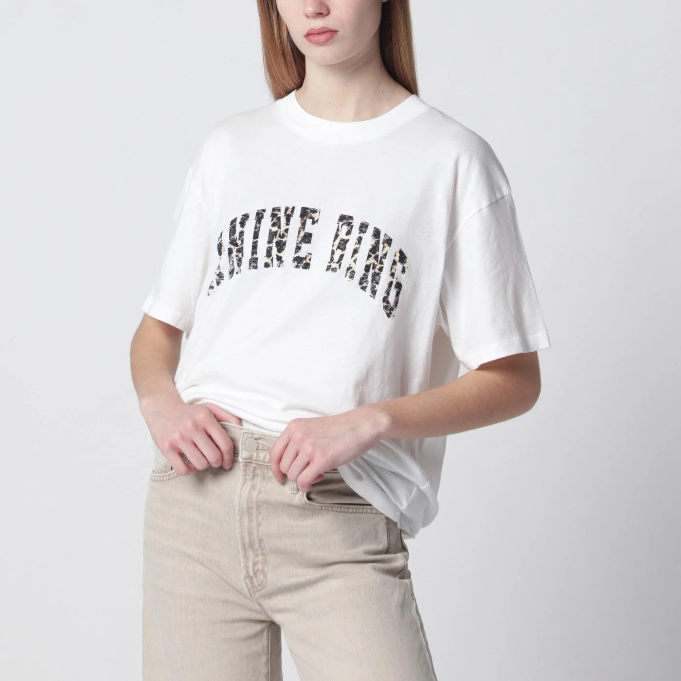 T-shirt by Anine Bing in ivory cotton• Ribbed crewneck• Short sleeves with dropped shoulders• Logo lettering print on the chest with leopard motif