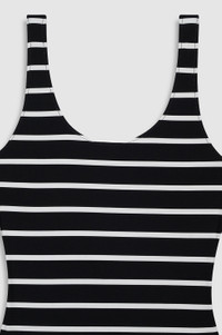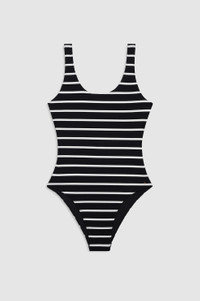 A timeless one-piece swimsuit constructed from a recycled nylon-spandex fabrication in black and white stripes. - Nylon-spandex blend - Fully lined - Close fit - Round neckline - Low scoop back - Modest coverage - Pull-on construction - Hand-tacked monogram charm FIT + MEASUREMENTS Close Fit: Take your true size. Model is wearing a size S. Model Measurements: Height: 5'7.5", Bust: 32", Waist: 23.5", Hips: 34.5" Product Measurements (Size S): Length: 26.5", Bust: 13", Waist: 11.5" MATERIAL + CARE 85% Recycled Nylon, 15% Spandex Hand wash Made in Indonesia