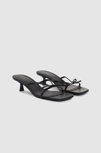A feminine strappy heel made from smooth 100% leather in black. - Leather - Front strap with bow detail - Square toe - Kitten heel - Cushioned insole - High-shine leather outsole FIT + MEASUREMENTS Take your true size. If you are between sizes, we recommend taking the next size up. Model is wearing a size 40. Model Measurements: Height: 5'7.5", Bust: 32", Waist: 23.5", Hips: 34.5" Product Measurements (Size 37): Heel Height: 1.8", Sole Length: 9.5", Sole Width: 3.1" MATERIAL + CARE 100% Cow Leather Spot clean Made in Portugal