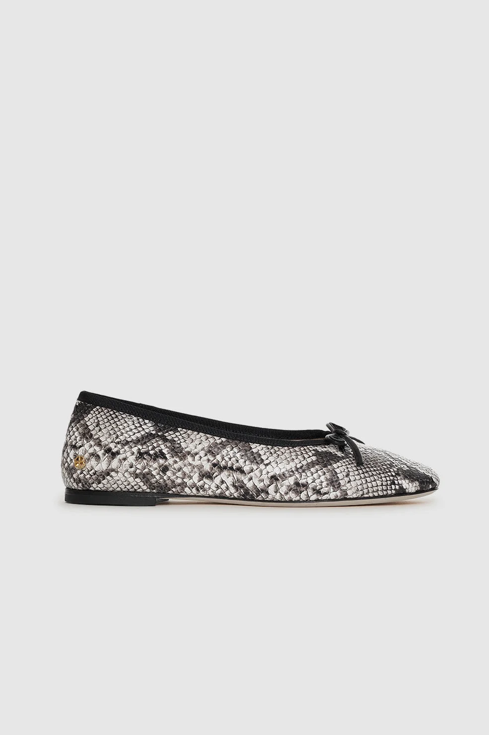A classic ballerina flat crafted in 100% leather with a black and white embossed python print. - Leather - Leather bow and grossgrain binding - Leather lining - Rounded toe - Flexible outsole - Cushioned insole - Gold monogram hardware FIT + MEASUREMENTS Take your true size. If you are between sizes, we recommend taking the next size up. Model is wearing a size 39. Model Measurements: Height: 5'10", Bust: 30", Waist: 24, Hips: 33.5" Product Measurements (Size 37): Heel Height: 0.3", Sole Length: 9.9", Sole Width: 3.1" MATERIAL + CARE 100% Cow Leather Spot clean Made in Portugal