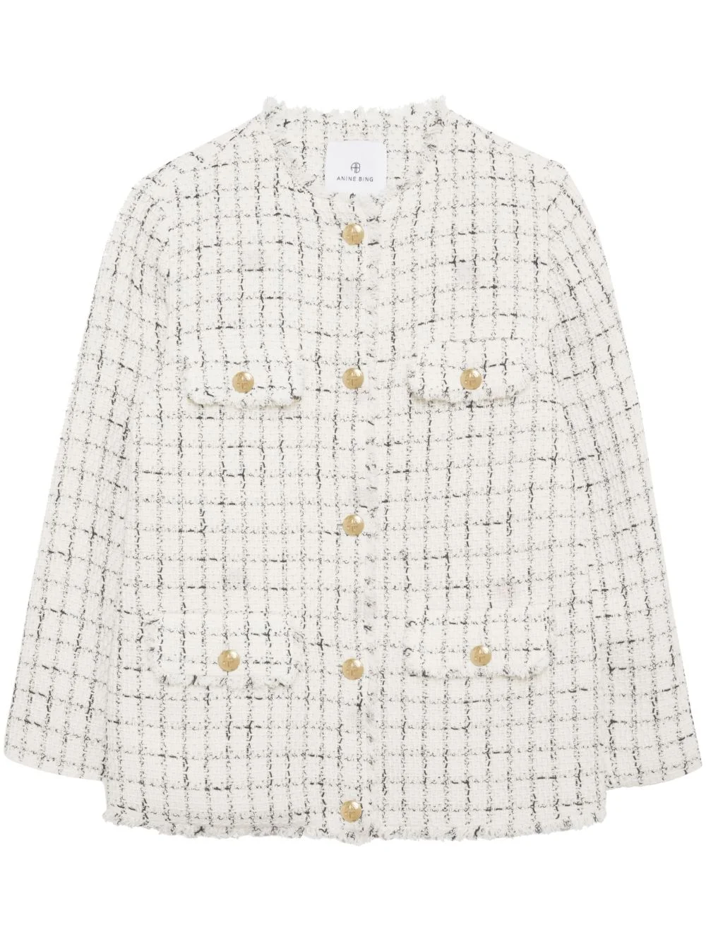 Janet plaid tweed jacket Anine Bing reimagines a vintage-inspired silhouette with the Janet Jacket. Crafted from a cotton-tweed fabrication, it showcases a monochromatic plaid pattern throughout. Cut for a relaxed fit, it features four flap pockets and is finished with raw-edge detailing. Highlights - White/black - Cotton blend - Plaid pattern - Tweed detailing - Round neck - Long sleeves - Gold-tone button fastening - Four front flap pockets - Straight hem Imported Composition Cotton 68%, Polyester 32% Washing instructions Dry Clean Only