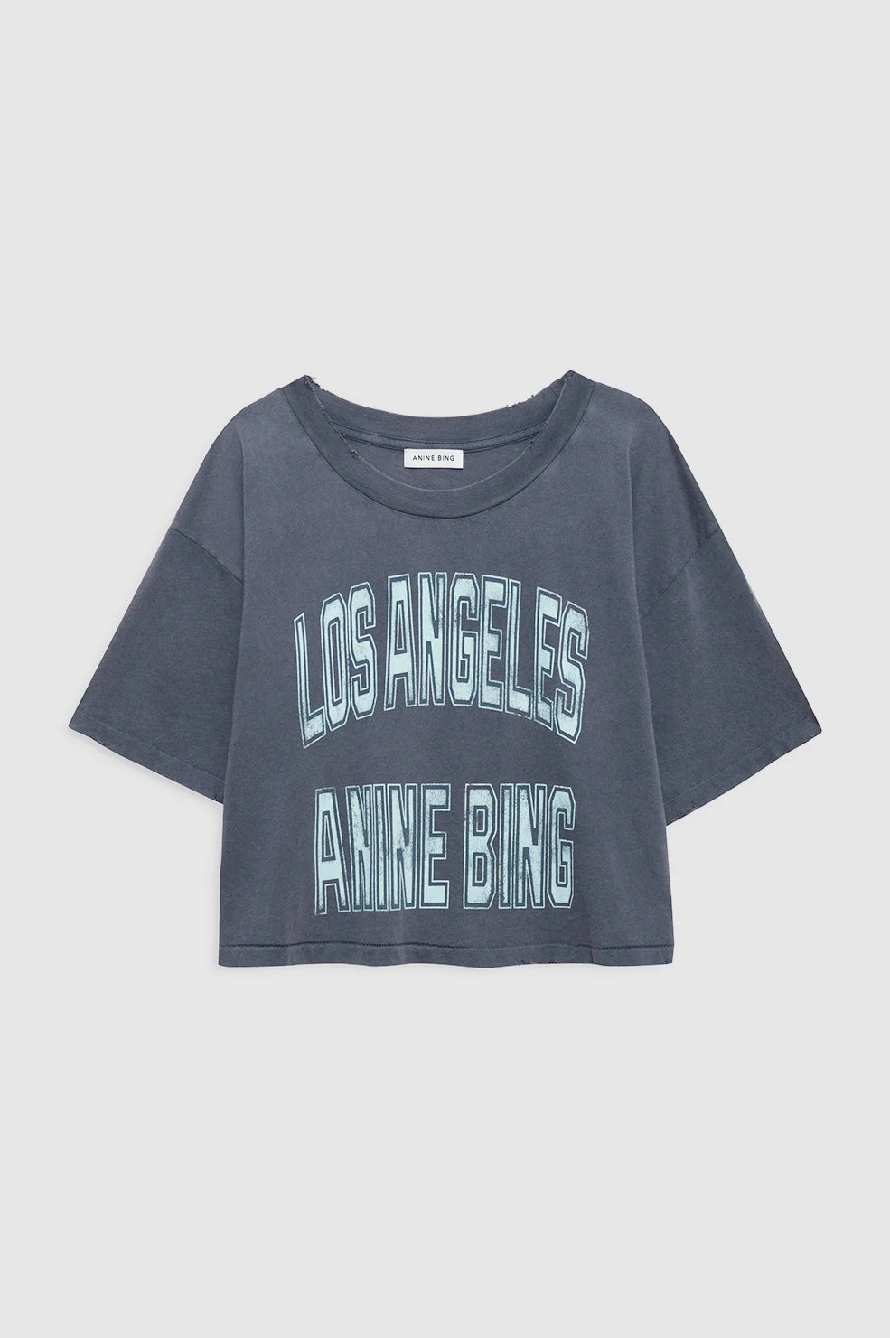The Johnny Tee is a cropped, relaxed silhouette crafted from soft, lightweight cotton in a heather grey hue, finished with a bold Los Angeles ANINE BING graphic across the front. A classic crew neckline with an effortless, worn-in feel. Style it with denim, tailored trousers, or layered under blazers for off-duty ease with attitude. - Cropped, boxy fit - Soft, lightweight cotton - Crew neckline - Short sleeves - Faded 'LOS ANGELES ANINE BING' screen print graphic with white outline at front. Please note: This item is handcrafted and will vary in color or appearance. FIT + MEASUREMENTS Boxy, Cropped Fit: Take your true size. Model is wearing a size S. Model Measurements: Height: 5'9.5", Bust: 32", Waist: 24.5", Hips: 33" Product Measurements (Size S): Length: 20", Bust: 22.5", Sleeve Length: 8" MATERIAL + CARE 100% Cotton Machine wash separately Made in Turkiye
