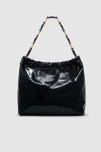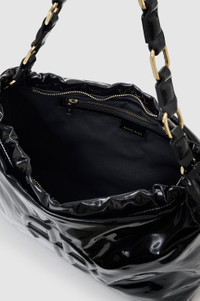 Inspired by the iconic Kate Tote, the Kate Shoulder Bag is constructed from 100% Nappa leather with a durable, high-shine black finish. This iconic silhouette features a strap made of interlocked signature links in gold-tone hardware. Its nostalgic construction includes a ruched elastic opening and top-zip closure to reveal a fully lined cotton-twill interior with a slip pocket and zipper pocket. Finished with an embossed ANINE BING monogram at the front. FIT + MEASUREMENTS Model Measurements: Height 5'9", Bust 30", Waist 23", Hips 34" Product Measurements: Height: 14.3", Width: 17.1" MATERIAL + CARE 100% Cow Leather Spot clean Made in Turkey