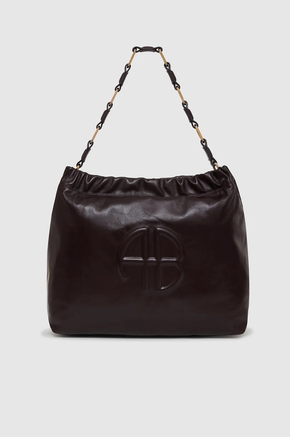Inspired by the iconic Kate Tote, the Kate Shoulder Bag is constructed from smooth 100% lamb leather in black with a slight sheen. This iconic silhouette features a strap made of interlocked signature links in gold-tone hardware. Its nostalgic construction includes a ruched elastic opening and top-zip closure to reveal a fully lined cotton-twill interior with a slip pocket and zipper pocket. Finished with an embossed ANINE BING monogram at the front. FIT + MEASUREMENTS Model is wearing a size OS. Model Measurements: Height: 5'9", Bust: 30", Waist: 23", Hips: 34" Product Measurements: Height: 14.3", Width: 17.1" MATERIAL + CARE 100% Lamb Leather Spot clean Made in Turkey