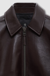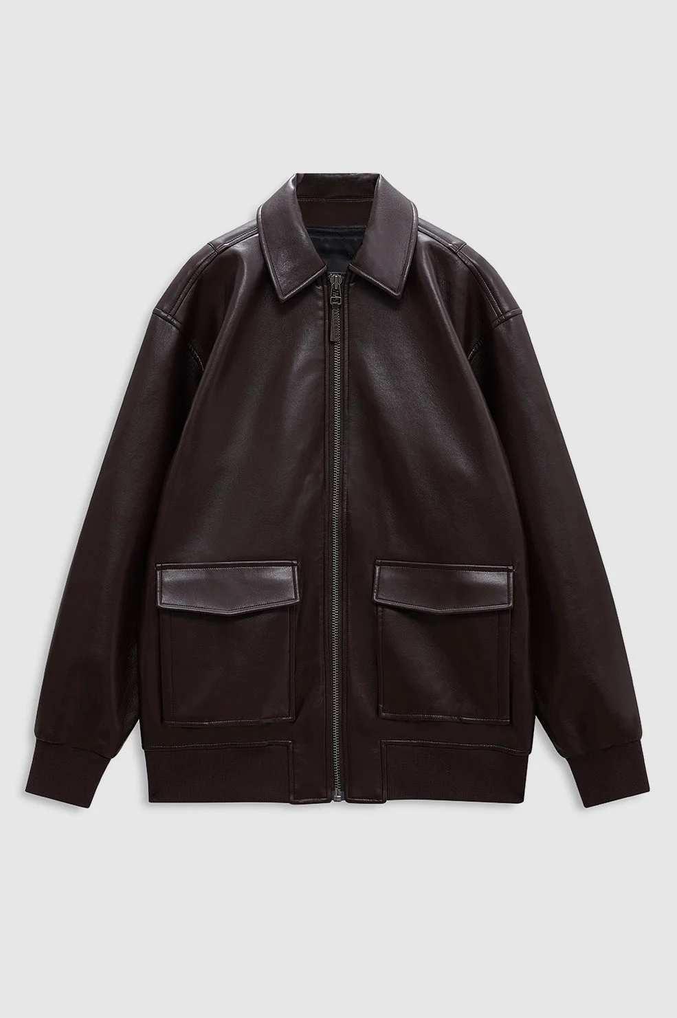 An oversized jacket featuring utility-inspired details made from midweight 100% regenerated leather in deep brown. - Regenerated leather - Fully lined - Zip fastening through front - Two patch pockets at the Hips: with snap closures - Ribbed trim along cuffs and hem FIT + MEASUREMENTS Classic Oversized Fit: Take your true size. Model is wearing a size S. Model Measurements: Height: 5'9", Bust: 30", Waist: 23", Hips: 34" Product Measurements (Size S): Length: 28.5", Bust: 47", Sleeve Length from Center Back: 34" MATERIAL + CARE 48% Leather, 25% Polyester, 27% Polyurethane Dry clean Made in China