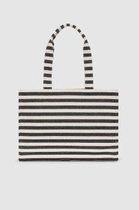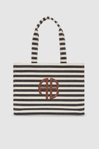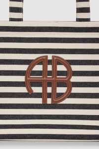A spacious book tote crafted from lightweight striped cotton canvas with cognac leather accents. - Cotton canvas - Fully lined cotton canvas interior - Two folded shoulder straps - One interior zipper pocket - One interior magnetic slip pocket - Monogram leather patch FIT + MEASUREMENTS Model Measurements: Height: 5'7.5", Bust: 32", Waist: 23.5", Hips: 34.5" Product Measurements: Height: 15.4", Width: 16.9" MATERIAL + CARE 100% Cotton Spot clean Made in China
