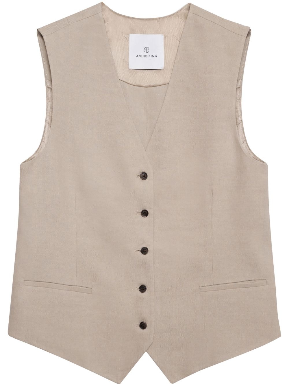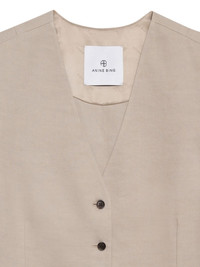 lena sleeveless vest Highlights - Sand beige - Linen blend - Button fastening - V-neck - Sleeveless - Two side slit pockets Imported Composition Linen/Flax 54%, Viscose 45%, Spandex/Elastane 1% SIZE & FIT Measurement BUST 33.07 in(84 cm) Shoulder Width 13.38 in(34 cm)