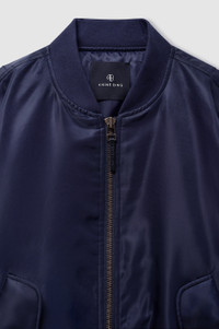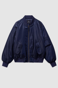 A traditional utilitarian-inspired bomber jacket made from a durable, slightly padded 100% polyester shell with a subtle sheen. - Polyester - Classic flight jacket details - Relaxed, oversized fit - Tonal interior lining - Two front flap pockets - Zipped sleeve pocket - Brass hardware - Ribbed knit trim at neck, cuffs, and waist FIT + MEASUREMENTS Relaxed, Oversized Fit: Take your true size. If a slightly smaller, more fitted silhouette is desired, we recommend taking one size down. Model is wearing a size S. Model Measurements: Height: 5'10", Bust: 30", Waist: 24, Hips: 33.5" Product Measurements (Size S): Length: 25", Bust: 51", Sleeve Length from Center Back: 33.5" MATERIAL + CARE 100% Polyester Dry clean Made in China