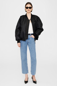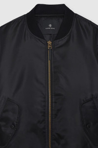 A traditional military-inspired bomber jacket made from a durable, slightly padded 100% polyester shell with a subtle sheen. Featuring traditional flight jacket details including tonal interior lining, two front flap pockets, a zipped sleeve pocket, and ribbed knit trim at the neck, cuffs, and waistband. Finished with a branded vegan-leather zipper pull down the center. The Leon Bomber is cut for a relaxed, oversized fit. For a true relaxed fit, take your true size. If a slightly smaller, more fitted silhouette is desired, we recommend taking one size down in this style. FIT + MEASUREMENTS The Leon Bomber is cut for a relaxed, oversized fit. For a true relaxed fit, take your true size. If a slightly smaller, more fitted silhouette is desired, we recommend taking one size down in this style. Model is wearing a size S. Model Measurements: Height: 5'10.5", Bust: 31", Waist: 24", Hips: 34" Product Measurements (Size S): Length: 24", Bust: 51", Sleeve Length from Center Back: 33.5" MATERIAL + CARE 100% Polyester Machine wash Made in China