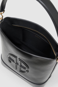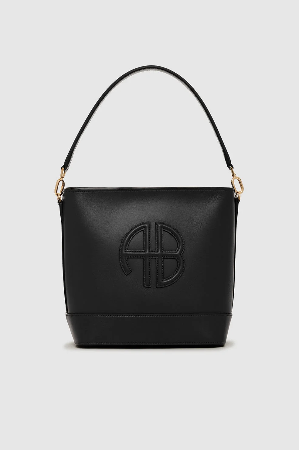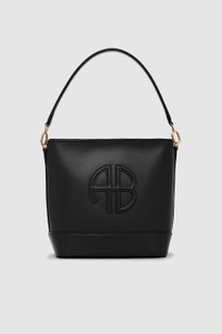 A modern bucket bag crafted from soft 100% leather in black. - Leather - Fully lined microsuede interior - Top-zip closure - One interior slip pocket - Removable shoulder and crossbody straps - Four gold feet at the base FIT + MEASUREMENTS Model Measurements: Height: 5'9", Bust: 30", Waist: 23", Hips: 34" Product Measurements: Height: 9.3", Width: 11.6", Short Strap Length: 11.9" MATERIAL + CARE 100% Cow Leather Spot clean Made in Turkiye