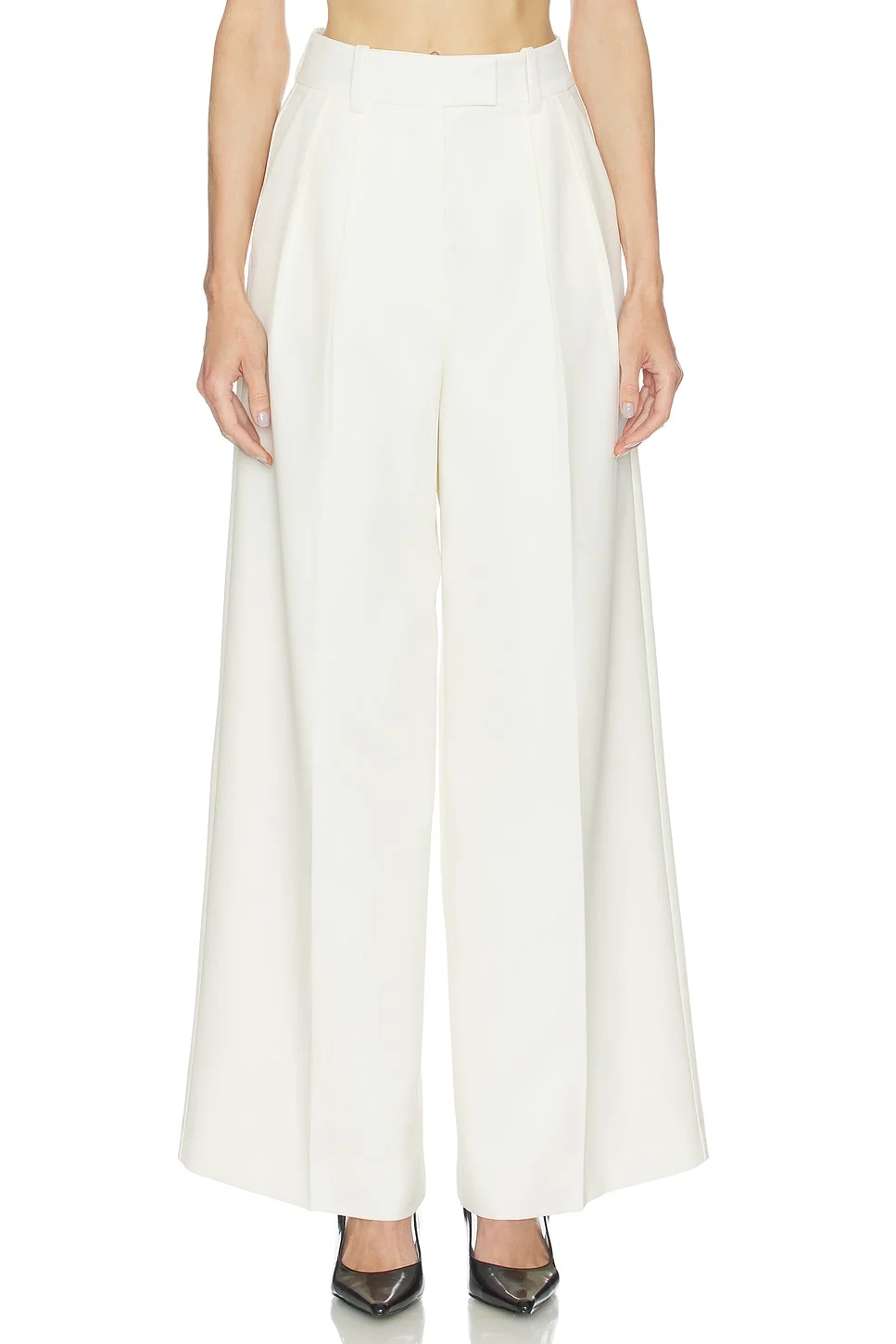 - Self: 52% polyester 48% wool Lining: 100% polyester - Made in China - Dry clean - Zip fly with hook and bar closure - Midweight canvas suiting fabric - Dual side seam pockets.28" at the leg opening - Revolve Style No. ANIN-WP127 - Manufacturer Style No. A-03-12198-WHT02