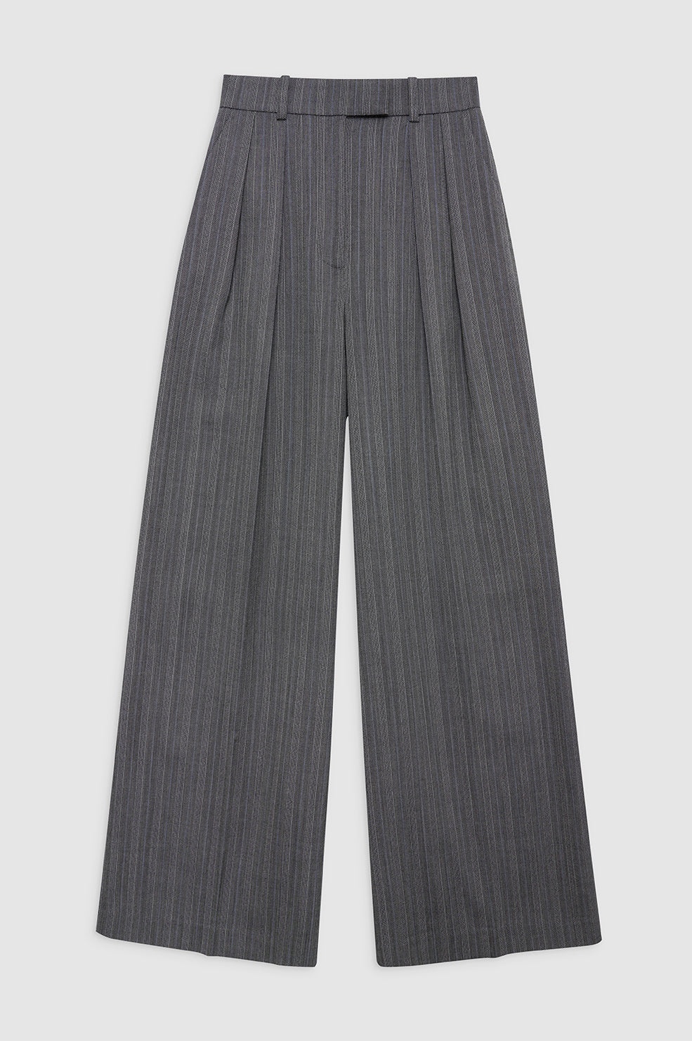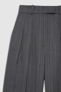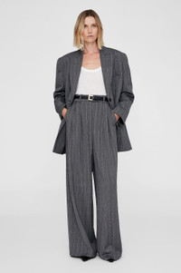 The Lou Trouser is crafted from a midweight, striped wool blend suiting fabrication with a subtle blue thread accent. Its oversized silhouette is half lined to the knee and features a tailored construction including double pleat detailing, an extended tab and zip-front closure, and one back welt pocket. Finished with an ultra-wide leg extending from the thigh down into a full-length inseam. The Lou Trouser is cut for an ultra-wide leg with a high-rise Waist:, slightly dropped crotch, and full-length inseam. Option to hem to your desired length. Take your true size. FIT + MEASUREMENTS The Lou Trouser is cut for an ultra-wide leg with a high-rise Waist:, slightly dropped crotch, and full-length inseam. Option to hem to your desired length. Take your true size. Model is wearing a size 34/4. Model Measurements: Height: 5'9.5", Bust: 32", Waist: 24.5", Hips: 33" Product Measurements (Size 36/6): Inseam: 32", Rise: 15.5", Waist: 28", Hip: 47", Leg Opening: 28.8" MATERIAL + CARE 99% Wool, 1% Polyester Dry clean Made in China