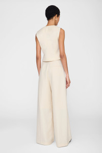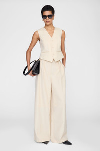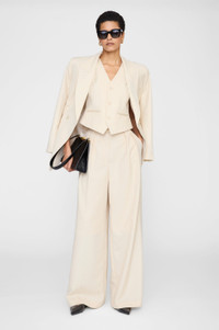 A modern tailoring statement defined by clean lines and soft structure. This cropped vest is cut with a sharp V-neckline and subtle waist shaping, creating a flattering, feminine silhouette. Precision seaming and a streamlined button front lend polish, while its length makes it ideal for pairing with high-rise trousers or layered beneath suiting. V-neckline Button-front closure Subtle waist shaping Cropped length Fully tailored construction FIT + MEASUREMENTS Designed for a slim, tailored fit that subtly contours through the waist. Model is wearing a size S. Model Measurements: Height: 5'11", Bust: 30", Waist: 23", Hips: 34" Product Measurements (Size S): Length: 20.6", Bust: 34.7" MATERIAL + CARE 52% Polyester, 48% Wool Dry clean Made in China