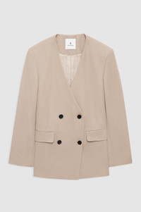 A constructed, collarless blazer in a lightweight, linen-viscose suiting fabrication with a classic oversized fit and double-breasted closure with four horn buttons. - Linen-viscose blend - Branded jacquard lining - Double-breasted, four-button closure - Padded shoulders - Two inner chest pockets - Two flap pockets at the hips - Four-button cuffs FIT + MEASUREMENTS Classic Oversized Fit: We recommend taking one to two sizes down if a closer fit is preferred. Model is wearing a size S. Model Measurements: Height: 5'9", Bust: 30", Waist: 23", Hips: 34" Product Measurements (Size S): Length: 30", Bust: 42", Sleeve Length from Center Back: 33.3" MATERIAL + CARE 60% Viscose, 22% Lyocell, 18% Linen Dry clean Made in Portugal