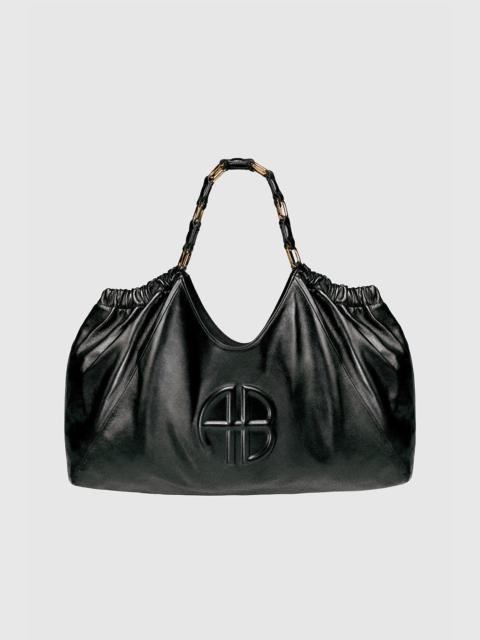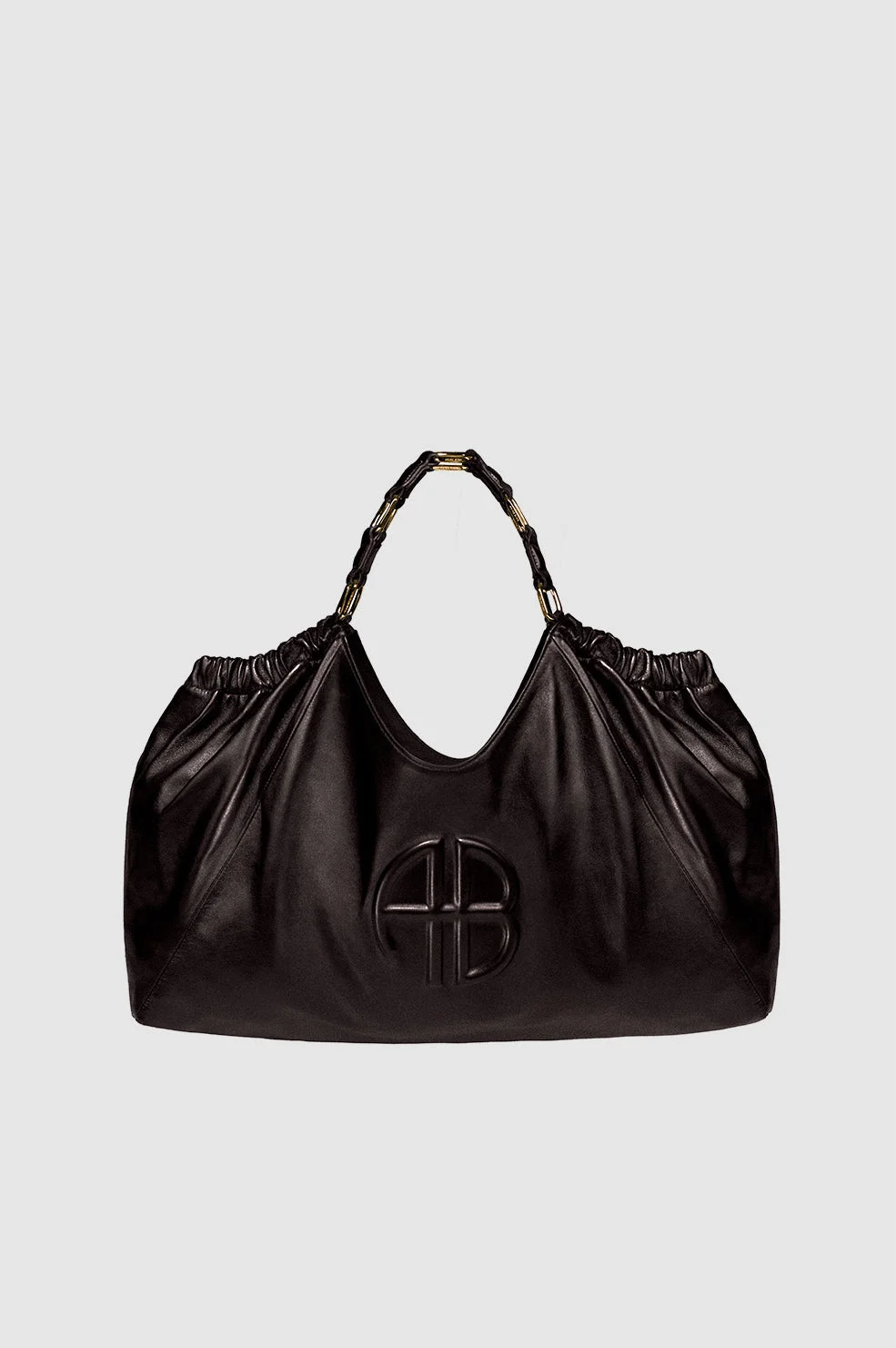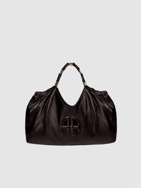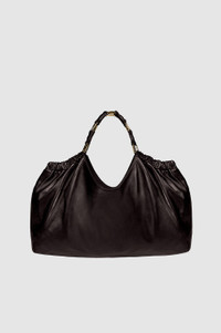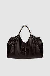 An elevated tote bag constructed from smooth leather in dark brown with a subtle sheen. - Leather - Magnetic snap closure - Interlocked link strap in gold-tone hardware - Fully lined cotton-twill interior - One interior zipper pocket - One interior slip pocket - Embossed ANINE BING monogram at the front FIT + MEASUREMENTS Model Measurements: Height: 5'9.5", Bust: 32", Waist: 24.5", Hips: 33" Product Measurements: Length: 14.2", Width: 17.5", Handle Drop: 7.7" MATERIAL + CARE 100% Lamb Leather Spot clean Made in Turkiye