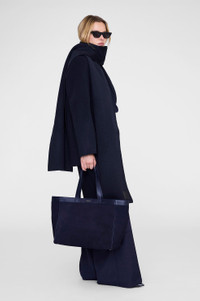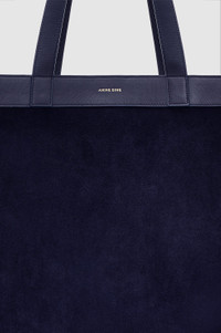 An minimal tote bag crafted in navy suede with tonal leather details. - Suede - Leather straps, bottom panel and trim - Fully lined black cotton-twill interior - One interior zip pocket - One interior slip pocket - Leather-covered magnet closure - ANINE BING gold stamp logo at front panel - Gold metal feet FIT + MEASUREMENTS Model is wearing a size OS. Model Measurements: Height: 5'10", Bust: 30", Waist: 24, Hips: 33.5" Product Measurements: Height: 11.8", Width: 13.8", Strap Length: 19.6" MATERIAL + CARE 100% Cow Leather Spot clean Made in Turkiye