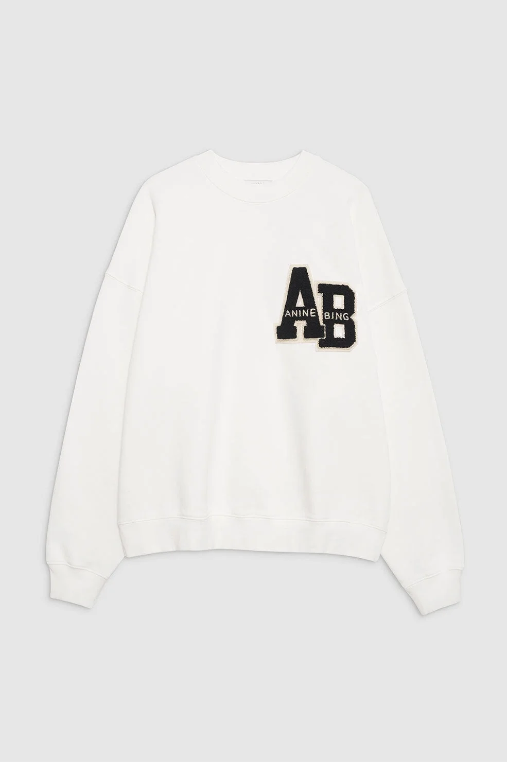 The Miles Oversized Sweatshirt Letterman is an oversized crewneck pullover made from midweight 100% organic cotton fleece in off white. This relaxed casual features a custom ANINE BING letterman chenille patch graphic at the chest in black and cream. The Miles Oversized Sweatshirt is cut for a relaxed, oversized fit with a slightly wider and shorter body than the Tyler Sweatshirt. Please note: This style runs large. We recommend sizing down if a closer fit is preferred. FIT + MEASUREMENTS The Miles Oversized Sweatshirt is cut for a relaxed, oversized fit with a slightly wider and shorter body than the Tyler Sweatshirt. Please note: This style runs large. We recommend sizing down if a closer fit is preferred. Model is wearing a size S. Model Measurements: Height: 5'10", Bust: 32", Waist: 23", Hips: 34" Product Measurements (Size S): Length: 26.5", Bust: 26", Sleeve Length from Center Back: 36" MATERIAL + CARE 100% Organic Cotton Machine wash Made in Turkey