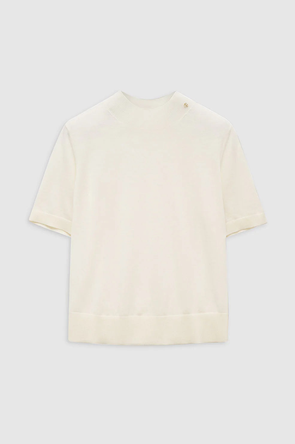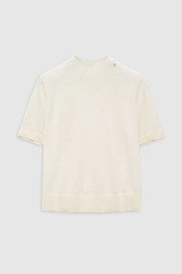 The Monique Sweater is crafted from a luxuriously lightweight wool-cashmere blend in an all-over jersey stitch with soft surface texture. It features contrast ribbed trim at its mock neckline, short sleeves, and hem for a relaxed yet fitted look. Finished with a small hand-tacked ANINE BING monogram charm. The Monique Sweater is cut for a relaxed silhouette with a fitted hem. Take your true size. FIT + MEASUREMENTS The Monique Sweater is cut for a relaxed silhouette with a fitted hem. Take your true size. Model is wearing a size S. Model Measurements: Height: 5'10.5", Bust: 31", Waist: 24", Hips: 34" Product Measurements (Size S): Length: 21", Bust: 20", Sleeve Length: 8.8" MATERIAL + CARE 90% Merino Wool, 10% Cashmere Dry clean Made in China