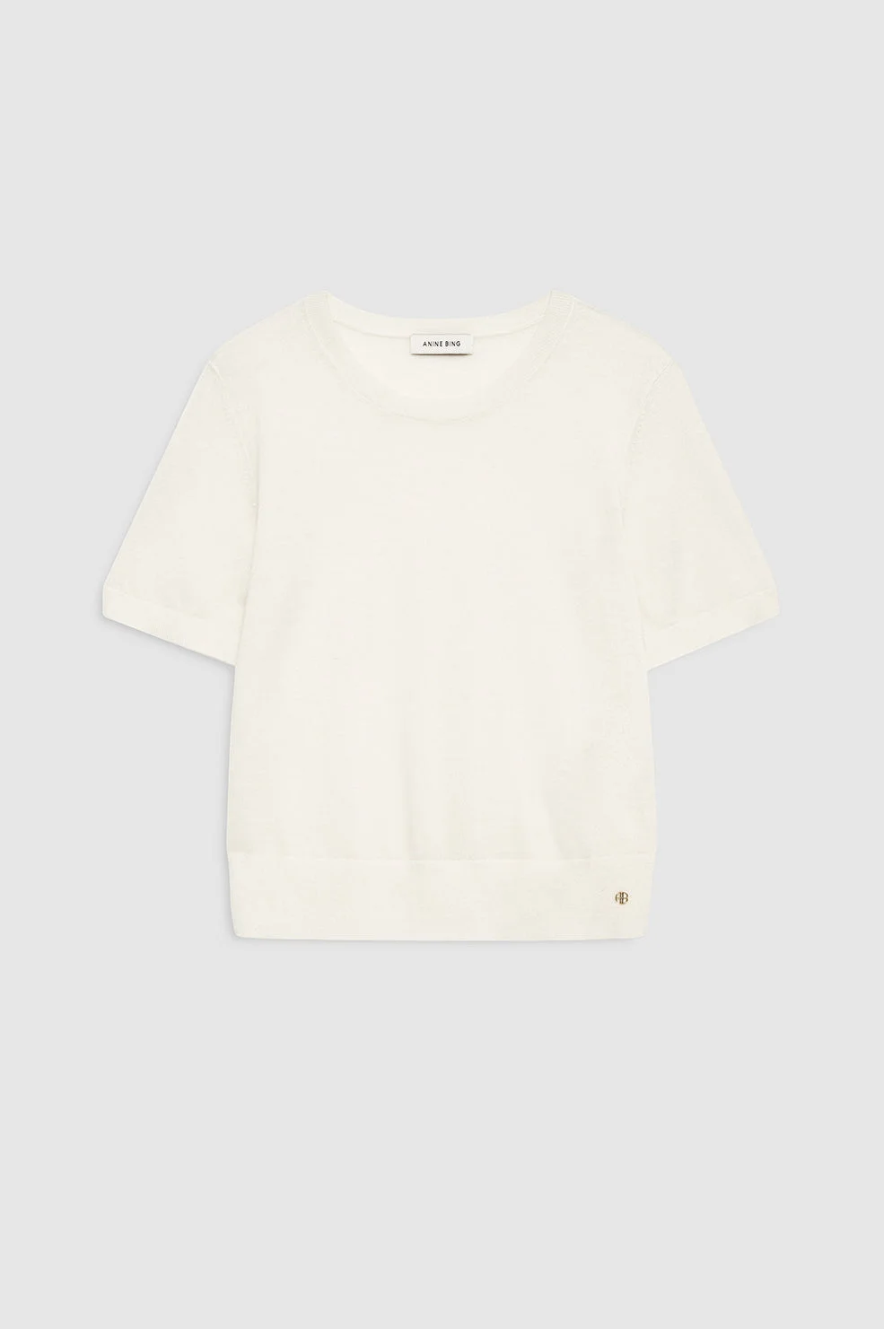 A timeless wardrobe essential made from a luxurious merino wool-cashmere yarn in ivory. - Merino wool-cashmere blend - Cropped, boxy fit - Rib detailing at the neck, cuffs, and waistband - Short sleeves FIT + MEASUREMENTS Cropped, Boxy Fit: Take your true size. Model is wearing a size S. Model Measurements: Height: 5'9", Bust: 30", Waist: 23", Hips: 34" Product Measurements (Size S): Length: 20.1", Bust: 17", Sleeve Length: 8.8" MATERIAL + CARE 90% Merino Wool, 10% Cashmere Hand wash Made in China