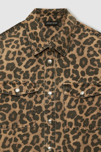 The Paxton Shirt is constructed from a midweight, rigid cotton denim blend without stretch in a vintage-inspired leopard. This modern workwear staple features wide shoulders, two patch pockets at the chest and front placket complete with branded snap buttons. The Paxton Shirt is cut for a cropped, boxy fit with wide shoulders. Take your true size. FIT + MEASUREMENTS Model is wearing a size S. Model Measurements: Height: 5'9", Bust: 30", Waist: 23", Hips: 34" Product Measurements (Size S): Length: 25.5", Bust: 52", Sleeve Length from Center Back: 33.5" MATERIAL + CARE 100% Cotton Machine wash separately Made in Turkey