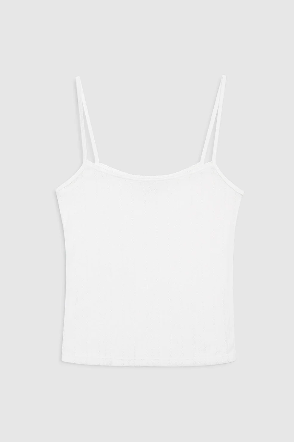 The Pia Cami Tank is a seasonal basic made from a delicate pointelle fabrication with a novelty trim. - Pointelle - Novelty trim - Cropped, slim fit - Soft square neckline - Thin straps FIT + MEASUREMENTS Cropped, Slim Fit: Take your true size. Model is wearing a size S. Model Measurements: Height: 5'9", Bust: 30", Waist: 23", Hips: 34" Product Measurements (Size S): Length: 16”, Bust: 14.5" MATERIAL + CARE 65% Polyester, 35% Rayon Machine wash Made in China