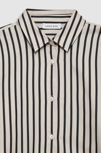 The Plaza Shirt is made from a black and tan striped 100% cotton shirting fabrication that's lightweight with a subtle drape. Its tailored silhouette features a long shirttail hem and mother of pearl buttons down the center-front placket. Finished with a tonal framed ANINE BING monogram embroidered at the wearer's right cuff. The Plaza Shirt is cut for a slightly oversized, boxy fit with a long shirttail hemline. Take your true size, or size down for a closer fit. FIT + MEASUREMENTS The Plaza Shirt is cut for a slightly oversized, boxy fit with a long shirttail hemline. Take your true size, or size down for a closer fit. Model is wearing a size S. Model Measurements: Height: 5'9.5", Bust: 32", Waist: 24.5", Hips: 33" Product Measurements (Size S): Length: 31.3", Bust: 48.3", Sleeve Length from Center Back: 34" MATERIAL + CARE 100% Cotton Dry clean Made in Turkiye
