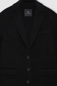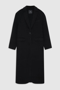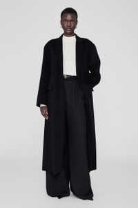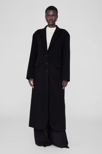 Inspired by the best-selling Quinn Blazer from the Classics Collection. The Quinn Coat is made from a soft, unlined double-faced wool-cashmere fabrication in black. Intentionally boxy and oversized with removable shoulder pads, this menswear-inspired layer features a single-breasted closure with three buttons, one welt pocket at the wearer's left chest, and two flap pockets at the hips. The Quinn Coat features an oversized maxi-length silhouette. We recommend taking one to two sizes down in this style if a closer fit is preferred. FIT + MEASUREMENTS The Quinn Coat features an oversized maxi-length silhouette. We recommend taking one to two sizes down in this style if a closer fit is preferred. Model is wearing a size XS. Model Measurements: Height: 5'9", Bust: 30", Waist: 23", Hips: 34" Product Measurements (Size S): Length: 51.5", Bust: 42", Sleeve Length: 23.3" MATERIAL + CARE 90% Wool, 10% Cashmere Dry clean Made in China