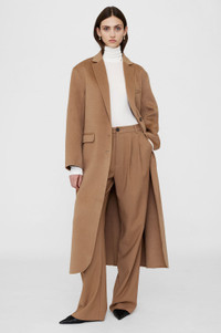 Inspired by the best-selling Quinn Blazer from the Classics Collection. The Quinn Coat is made from a soft, unlined double-faced wool-cashmere fabrication in camel. Intentionally boxy and oversized with removable shoulder pads, this menswear-inspired layer features a single-breasted closure with three buttons, one welt pocket at the wearer's left chest, and two flap pockets at the hips. The Quinn Coat features an oversized maxi -length silhouette. We recommend taking one to two sizes down in this style if a closer fit is preferred. FIT + MEASUREMENTS The Quinn Coat features an oversized maxi-length silhouette. We recommend taking one to two sizes down in this style if a closer fit is preferred. Model is wearing a size XS. Model Measurements: Height: 5'9.5", Bust: 32", Waist: 23.5", Hips: 34.5" Product Measurements (Size S): Length: 51.5", Bust: 42", Sleeve Length: 23.3" MATERIAL + CARE 90% Wool, 10% Cashmere Dry clean Made in China