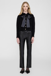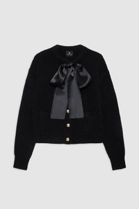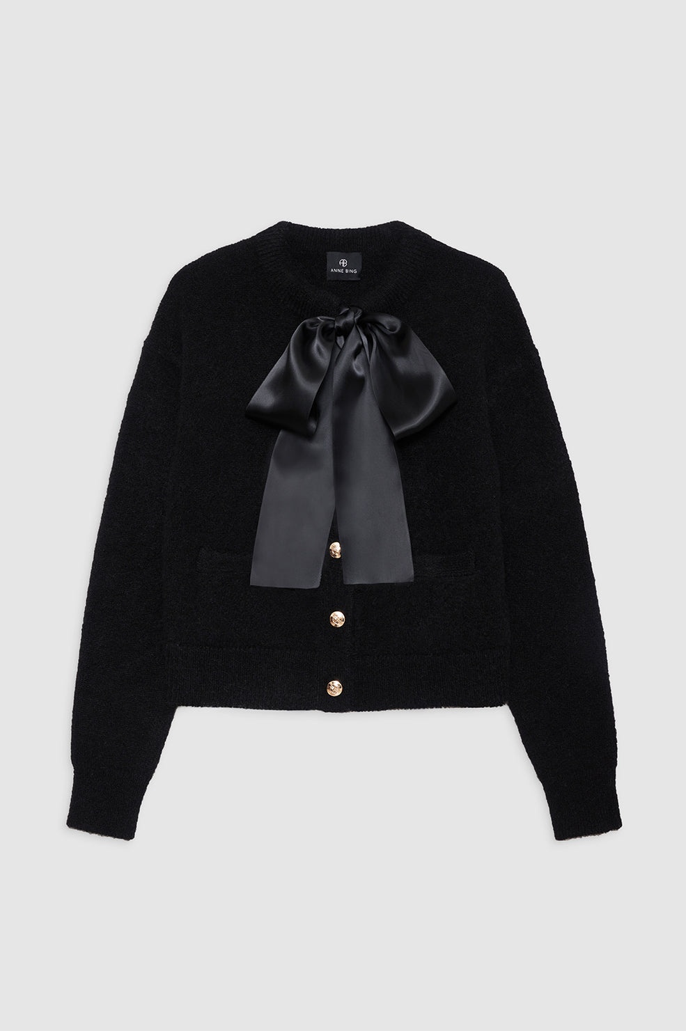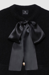 Featured in Google's Holiday 100 Gift Guide The Rhodes Cardigan is a feminine knit made from a fuzzy alpaca blend yarn with a soft hand. This seasonal separate features a removable satin bow that ties at the neck. Embellished with gold ANINE BING branded buttons. The Rhodes Cardigan is cut for a cropped, boxy silhouette. Take your true size. FIT + MEASUREMENTS The Rhodes Cardigan is cut for a cropped, boxy silhouette. Take your true size. Model is wearing a size S. Model Measurements: Height 5′10", Bust 32", Waist 24", Hips 35" Product Measurements (Size S): Length: 19.8", Bust: 19.5", Sleeve Length from Center Back: 31.5" MATERIAL + CARE 78% Alpaca, 19% Recycled Nylon, 3% Spandex Hand wash Made in China