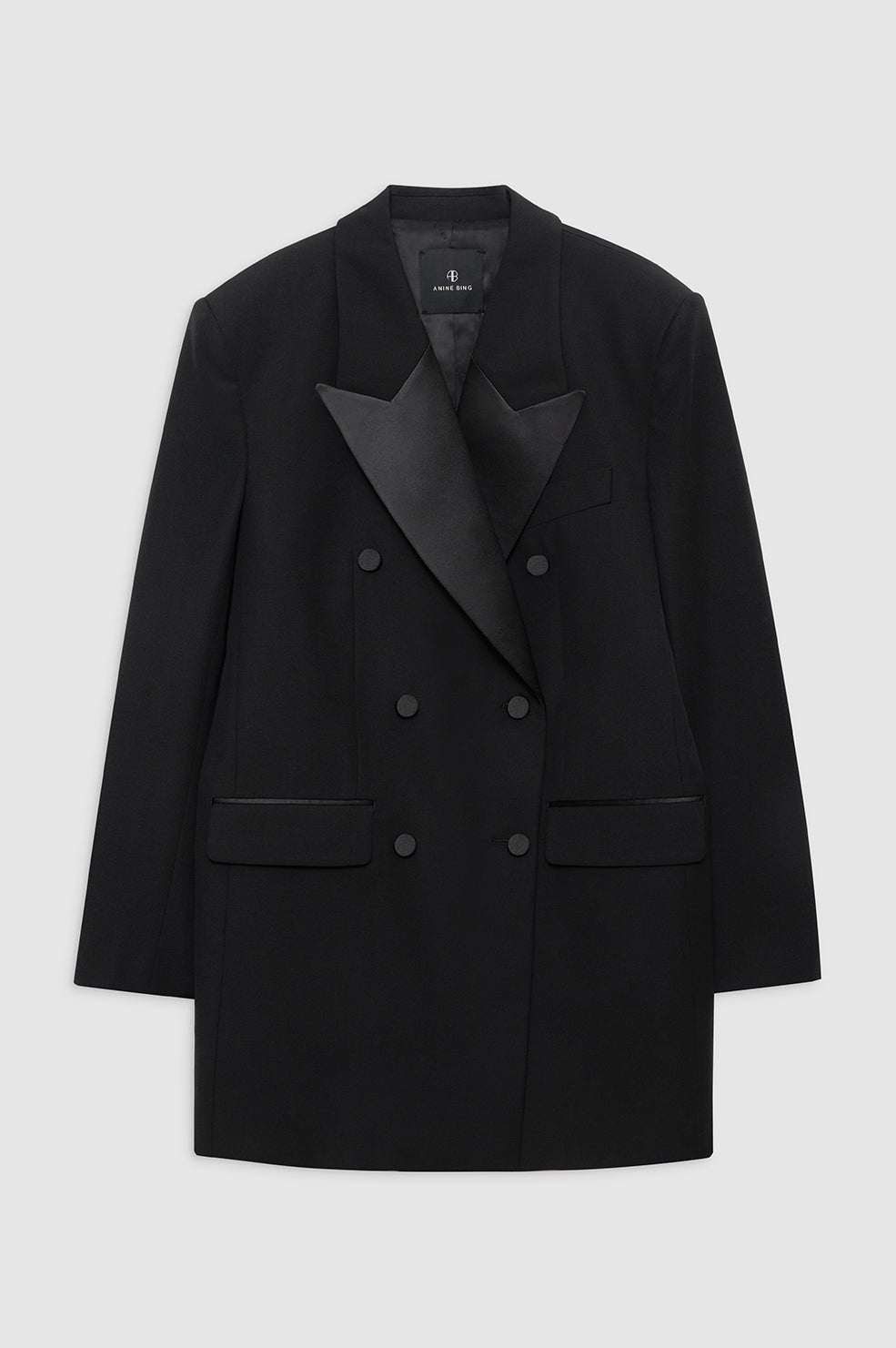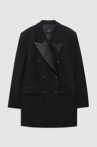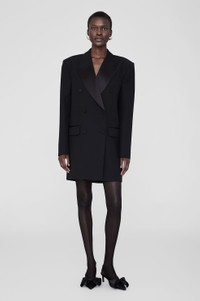 A tuxedo-style dress crafted from midweight 100% wool with a clean look and soft hand. The Ross Dress has a boxy silhouette featuring satin lapels, a double-breasted closure with satin-covered buttons, and sharp, constructed shoulder pads. Finished with one welt chest pocket, two flap pockets at the hips, two interior pockets, and four-button cuffs. The Ross Dress features a fitted, boxy silhouette with a mini-length hemline. Take your true size. FIT + MEASUREMENTS The Ross Dress features a fitted, boxy silhouette with a mini-length hemline. Take your true size. Model is wearing a size S. Model Measurements: Height: 5'9", Bust: 30", Waist: 23", Hips: 34" Product Measurements (Size S): Length: 34”, Bust: 39.5", Sleeve Length from Center Back: 33.5" MATERIAL + CARE 100% Wool Dry clean Made in China