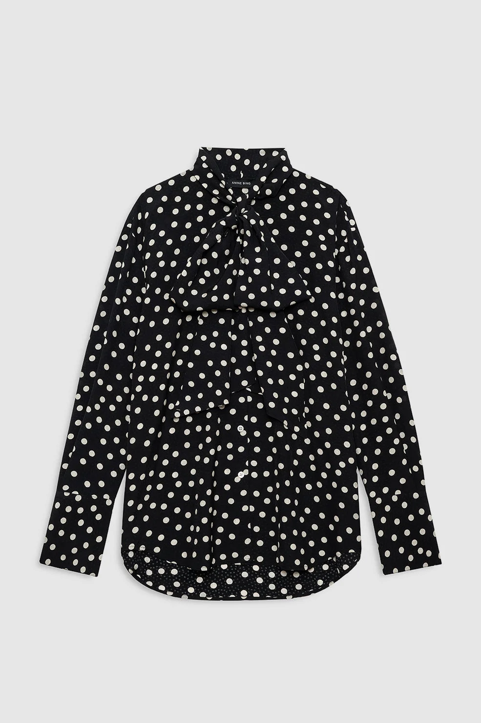The Ruby Shirt is a flattering, high-neck style made in a double-dot jacquard print. - Long sleeve - High-neck - Tie closure at neck FIT + MEASUREMENTS Model is wearing a size S. Model Measurements: Height: 5'9", Bust: 30", Waist: 23", Hips: 34" Product Measurements (Size S): Length: 29", Bust: 44.5", Sleeve Length from Center Back: 33.5" MATERIAL + CARE 100% Viscose Made in China