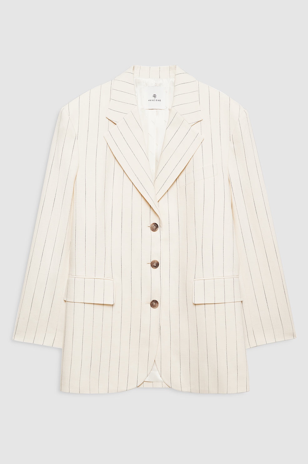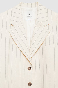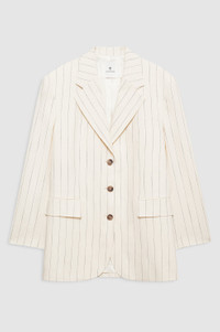 A constructed blazer in a midweight, textured pinstripe suiting fabrication with a fashion oversized fit, notched collar, and single-breasted, three-button closure. - Viscose blend - Branded jacquard lining - Single-breasted, three-button closure - Notched collar - Padded shoulders - Long hemline - One welt pocket at the chest - Two flap pockets at the hips - Four-button cuffs - Back vent FIT + MEASUREMENTS Fashion Oversized Fit: We recommend taking one to two sizes down if a closer fit is preferred. Model is wearing a size S. Model Measurements: Height: 5'7.5", Bust: 32", Waist: 23.5", Hips: 34.5" Product Measurements (Size S): Length: 32", Bust: 42.5", Sleeve Length from Center Back: 33.5" MATERIAL + CARE 91% Viscose, 8% Polyester, 1% Elastane Dry clean Made in Portugal