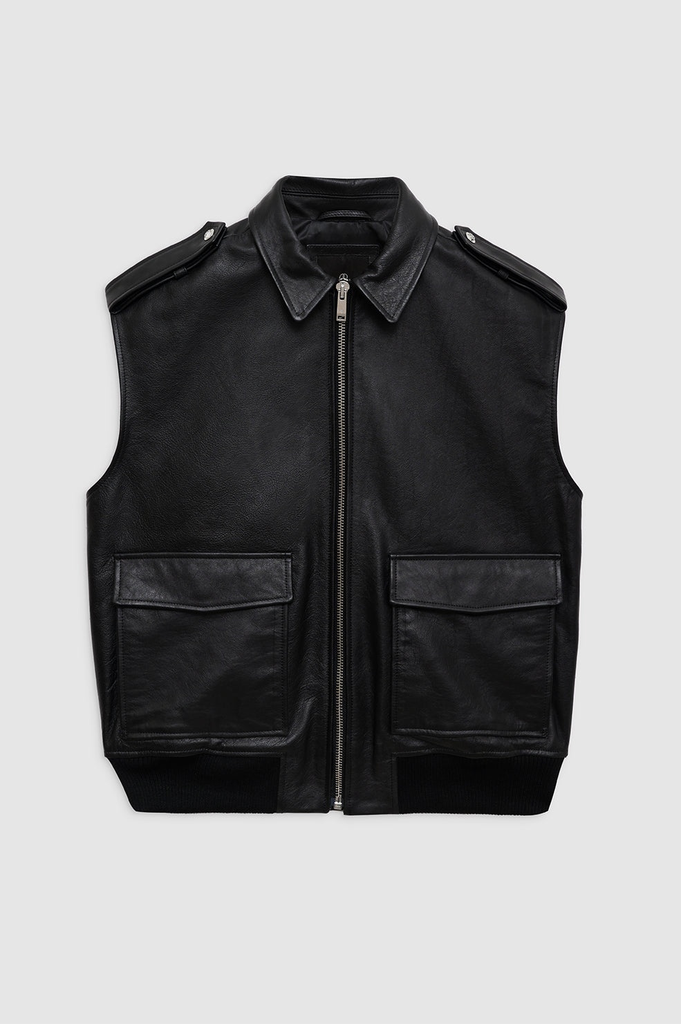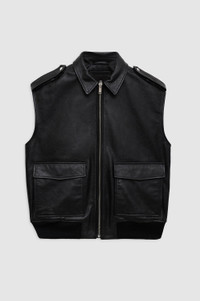 The Sonnie Vest is a fully lined, oversized layer constructed from heavyweight 100% leather with a slight sheen for a vintage look and feel. Featuring a branded leather zipper pull, antique silver hardware throughout, two large patch pockets with snap closures, and two hidden side pockets. Finished with ribbed trim along the hem. The Sonnie Vest is cut for an oversized fit. Take your true size. FIT + MEASUREMENTS The Sonnie Vest is cut for an oversized fit. Take your true size. Model is wearing a size S. Model Measurements: Height: 5'9.5", Bust: 32", Waist: 24.5", Hips: 33" Product Measurements (Size S): Length: 26.5”, Bust: 47" MATERIAL + CARE Cow Leather Dry clean Made in Turkiye