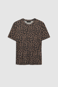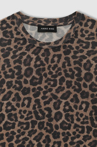 A short sleeve crewneck tee in a super fine, sheer jersey fabrication in a vintage-inspired leopard print. - Wool-tencel blend - Close fit - Crew neckline - Short sleeves FIT + MEASUREMENTS Model is wearing a size S. Model Measurements: Height: 5'9", Bust: 30", Waist: 23", Hips: 34" Product Measurements (Size S): Length: 22.5", Bust: 16.5", Sleeve Length from Center Back: 31.5" MATERIAL + CARE 80% Tencel 20% Wool Hand wash Made in China
