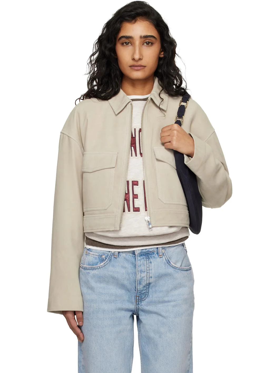 Goatskin suede jacket. · Spread collar · Zip closure · Flap pockets at chest · Cropped hem · Dropped shoulders · Welt pocket at interior · Logo-woven satin twill lining · Logo-engraved silver-tone hardware Supplier color: Taupe Body: 100% goatskin. Lining: 100% polyester. Made in Turkey 261092F063000
