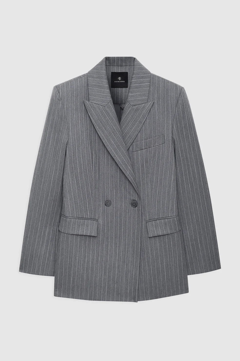 The new Tiphaine Blazer is cut in a soft light grey pinstripe that feels timeless, but never boring. Structured through the shoulders with an easy, relaxed drape, it’s the kind of blazer that instantly sharpens denim, elevates trousers, and makes layering feel intentional. Wear it buttoned, thrown over a knit, or styled head-to-toe for full power-suit energy. - Relaxed, modern fit - Double-breasted front - Classic notch lapels - Structured shoulders - Front flap pockets FIT + MEASUREMENTS Relaxed Fit: Take your true size. Model is wearing a size S. Model Measurements: Height: 5'10", Bust: 31", Waist: 23", Hips: 34.5" Product Measurements (Size S): Length: 30.1", Bust: 34.6", Sleeve Length from Center Back: 33" MATERIAL + CARE 98% Wool 2% Other Fibers Dry clean Made in Bulgaria