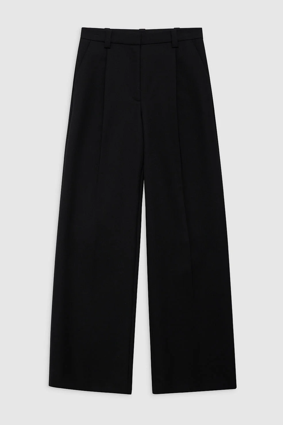 The Trent Trouser features a traditional tailored silhouette made from a midweight, textured wool suiting fabrication in black. - Wool blend - Half-lined to the knee - Relaxed fit - Low-to-mid rise - Front zip opening with a hook and bar closure - Wide leg - Long inseam - Functional belt loops - Pleat detailing - Front slanted pockets FIT + MEASUREMENTS Low-To-Mid Rise, Relaxed Leg, Full-Length Inseam: Take your true size. Model is wearing a size 32/2. Model Measurements: Height: 5'9.5", Bust: 32", Waist: 24.5", Hips: 33" Product Measurements (Size 36/6): Inseam: 33", Rise: 11.8", Waist: 30", Hip: 40", Leg Opening: 22" MATERIAL + CARE 52% Polyester, 48% Wool Dry clean Made in China