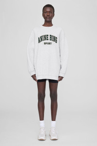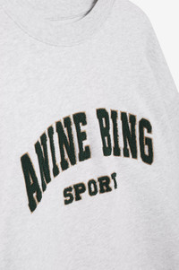The Tyler Sweatshirt from ANINE BING Sport is an oversized crewneck pullover made from our signature French terry in heather grey. It features a chenille patch graphic in emerald green collegiate lettering at the chest with khaki embroidery, rounding out its athletic-inspired look. This style is finished with ribbed trim at the collar, cuffs, and hem. The Tyler Sweatshirt is cut for an oversized fit. Take your true size. FIT + MEASUREMENTS The Tyler Sweatshirt is cut for an oversized fit. Take your true size. Model is wearing a size S. Model Measurements: Height: 5'9.5", Bust: 32", Waist: 24", Hips: 35" Product Measurements (Size S): Length: 29", Bust: 26.5", Sleeve Length: 32" MATERIAL + CARE 100% Organic Cotton Machine Wash. Made In Turkey
