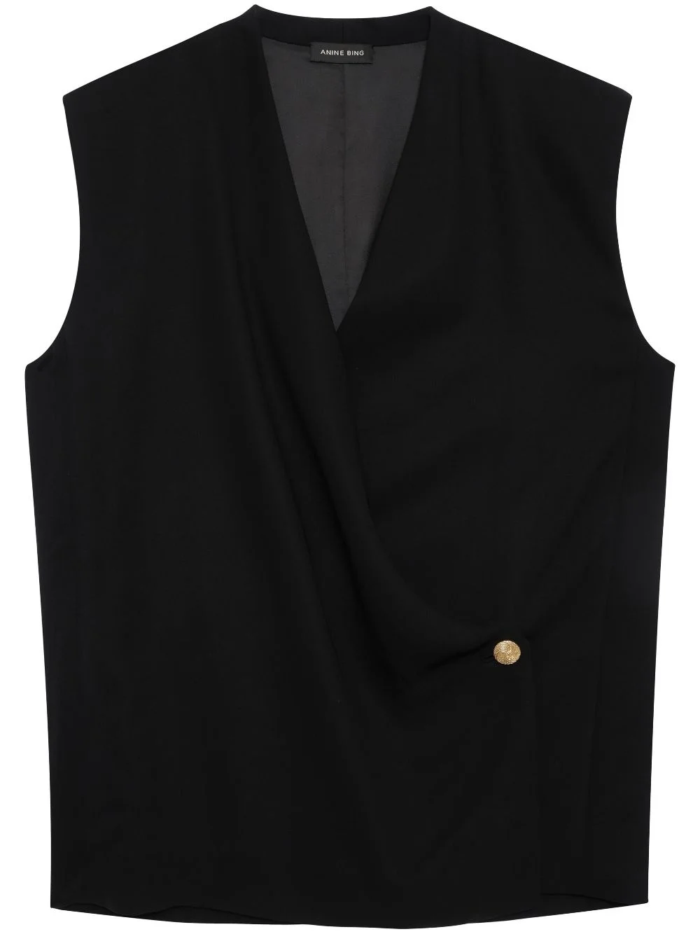 Venice wrap vest Highlights - Black - Stretch-design - Wrap design - Embossed gold-tone buttons - V-neck - Sleeveless - Off-centre front button fastening - Straight hem - Full lining Made in United States Composition Viscose 96%, Spandex/Elastane 4% SIZE & FIT Measurement BUST 42.51 in(108 cm) Shoulder Width 17.71 in(45 cm) Washing instructions Dry Clean Only