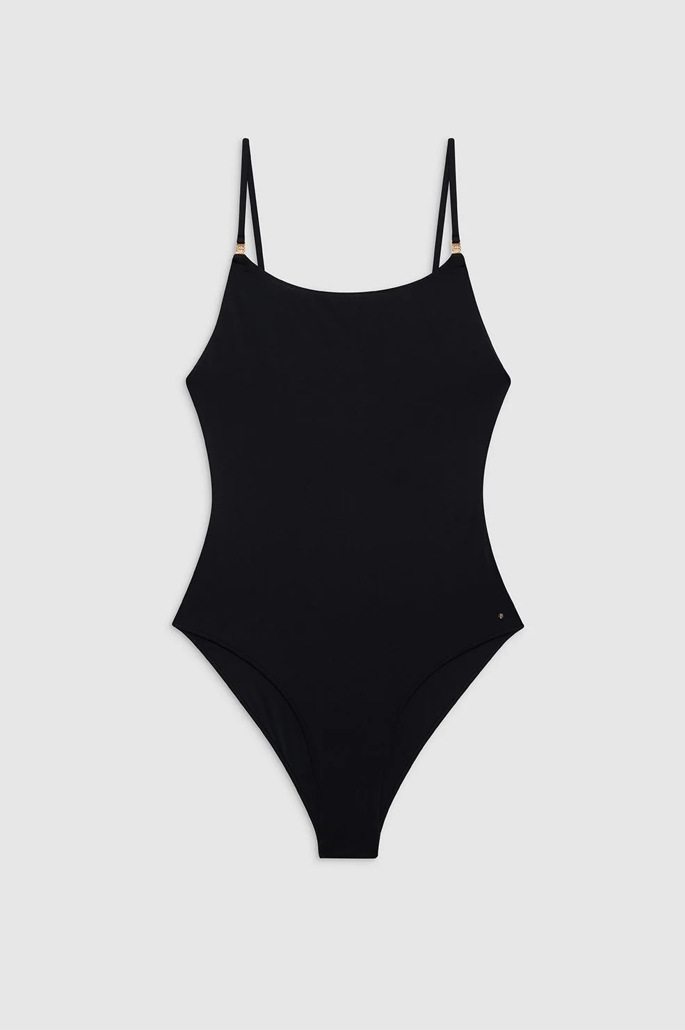 The Vesta One Piece is a minimalist swimsuit constructed from a soft and stretchy swim fabrication in black. Its fully lined and features a clean silhouette with a rounded square neckline, thin adjustable straps, and a pull-on construction. Finished with a small hand-tacked ANINE BING monogram charm. The Vesta One Piece is cut for a close, second-skin fit with modest coverage. Take your true size. FIT + MEASUREMENTS The Vesta One Piece is cut for a close, second-skin fit with modest coverage. Take your true size. Model is wearing a size S. Model Measurements: Height: 5'9", Bust: 30", Waist: 23", Hips: 34" Product Measurements (Size S): Length: 22.8", Bust: 12", Waist: 12.3" MATERIAL + CARE 85% Recycled Nylon, 15% Spandex Hand wash Made in Indonesia