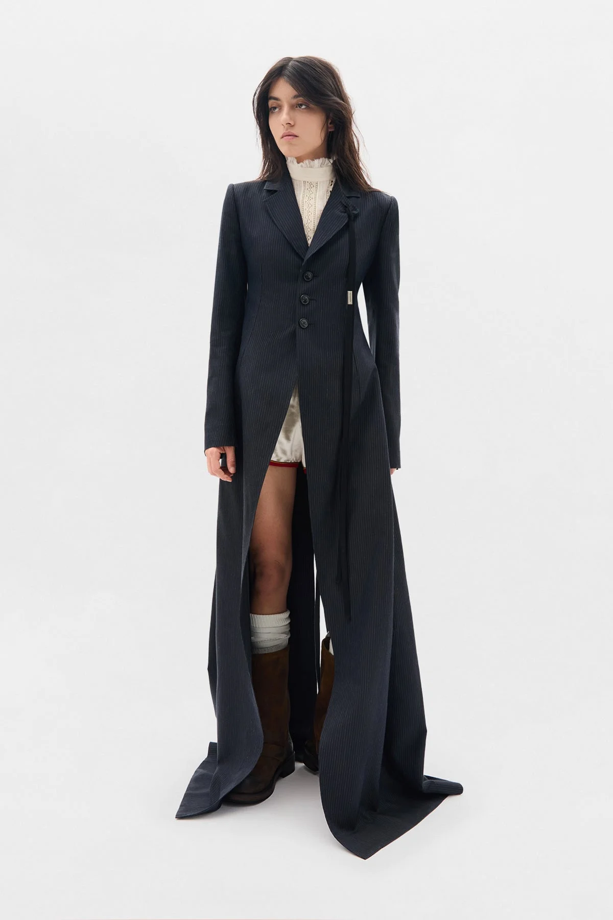 Abke X-Long Open Front Fitted Coat - Navy/Grey - Striped Fabric - Extended Length - Open Front Design - Buttoned Closure - Tailored Fit - Adjustable Waist Straps - 51% Cotton 49% Viscose - Made in Italy Model wears italian size 40 Care To maintain the beauty and integrity of your purchase, we recommend treating it with care. Simple maintenance practices, such as gentle washing and proper storage, can effectively preserve the longevity of your favorites. We encourage you to refer to the care instructions included with each item, designed to help you keep your purchase in top condition. Design Our dedication to excellence extends beyond materials; it encompasses the artistry and craftsmanship illustrated in every piece we create.