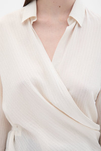 Alba Asymmetric Wrap Shirt - Chalk - Viscose Silk Cotton Blend - Asymmetric Wrap Design - Long Sleeves - Side Tie Detail - Slim Fit - 70% Viscose 17% Silk 13% Cotton - Made in Italy Model wears italian size 40 Care To maintain the beauty and integrity of your purchase, we recommend treating it with care. Simple maintenance practices, such as gentle washing and proper storage, can effectively preserve the longevity of your favorites. We encourage you to refer to the care instructions included with each item, designed to help you keep your purchase in top condition. Design Our dedication to excellence extends beyond materials; it encompasses the artistry and craftsmanship illustrated in every piece we create.