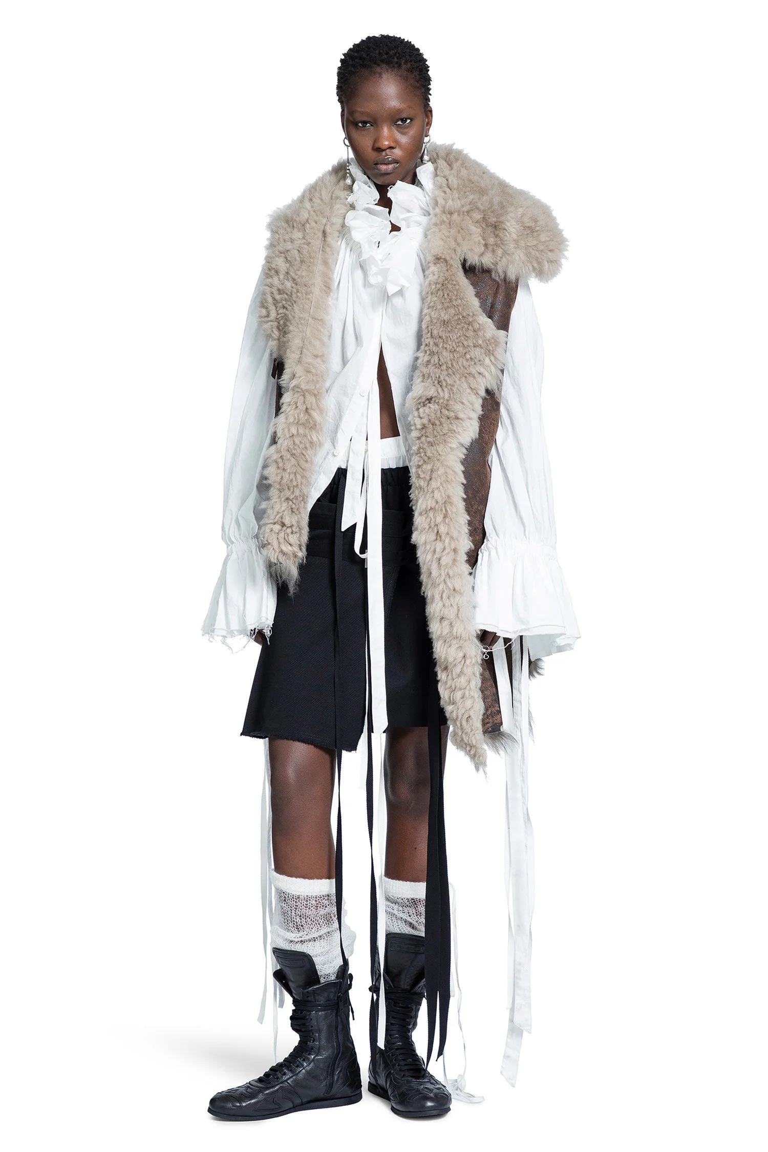 DESCRIPTION - Runway style - Multicolor - Brown/taupe - Distressed leather patchwork - Felted velvet shearling collar - Open front - Shearling lining - Sleeveless - Asymmetric shearling hem DETAILS - Made in: Italy - Composition: 100% Lambskin 100% Shearling - Model code: B0013462FR006 D0063 - Item ID: 9748360855894 SIZE & FIT Model wears size S Model Height 177 cm Bust 74 cm Waist 58 cm Hips 85 cm