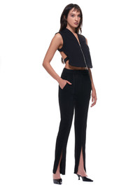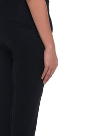 Ann Demeulemeester amedeo trousers in black, adjustable waist with bar-and-hook closure, belt loops, zip-up fly, front waist slash hand pockets, vented/tapered through leg, rear pouch pocket, straight/finished hem, tonal stitching. Made in Portugal. French sizing. Composition - 90% Rayon, 8% Virgin Wool, 2% Elastane Model Measurements: Model is 5ft 6" and wearing a size 38. Bust: 27" Waist: 23" Hip: 32"
