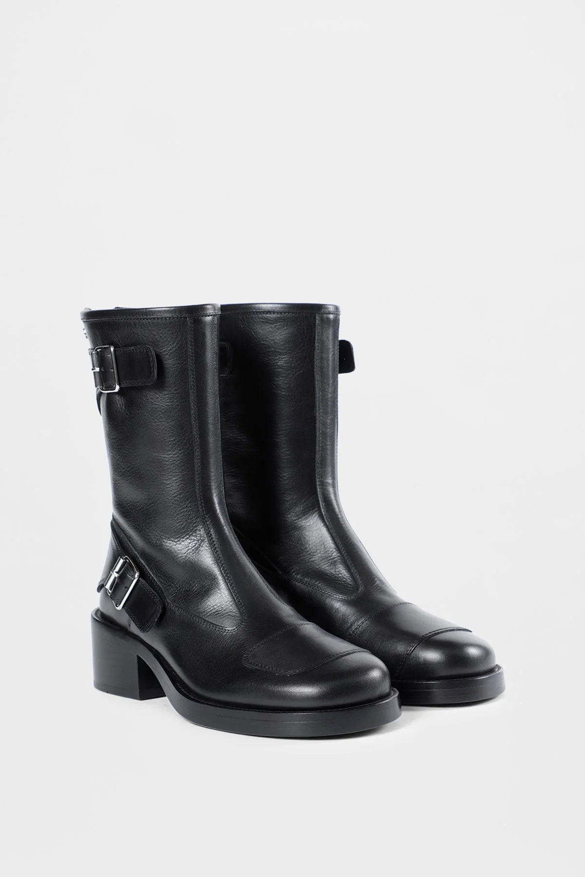 Eero Ankle Biker Boots - Black - Wrap with Buckled Belt Straps - Back Zip Closure with Signature Rivet Detail - Leather Sole- Block Heel - 100% Calf Leather - Made in Italy Ann Demeulemeester shoes embody the essence of luxury and comfort. The generously wide fit is a design choice aimed at ensuring a comfortable wear. For those who prefer a snugger fit, we recommend using an insole. Crafted from the highest quality leather, it is natural for the shoes to feel stiff initially. By wearing and walking in them, they will perfectly mold to the shape of your feet, offering unparalleled comfort. The fit of this item is regular comfort. Consider to purchase your usual size. Care To maintain the beauty and integrity of your purchase, we recommend treating it with care. Simple maintenance practices, such as gentle washing and proper storage, can effectively preserve the longevity of your favorites. We encourage you to refer to the care instructions included with each item, designed to help you keep your purchase in top condition. Design Our dedication to excellence extends beyond materials; it encompasses the artistry and craftsmanship illustrated in every piece we create.