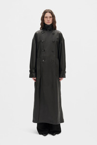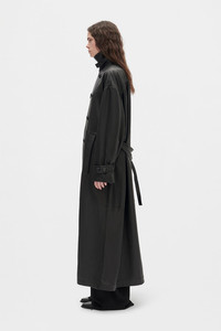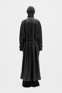 Ansa Double-Breasted Trench Coat - Black - Structured Satin Leather - Collar - Buckled Throat Latch - Double-Breasted - Button Closure - Side Pockets - Dropped Shoulders - Buttoned Cuff Tabs - Back Gathered Shoulder Yoke - Draped Back - Straight Fit - 100% Lamb Leather - Made in Italy Model wears italian size 40 The fit of this item is oversize. If you prefer a narrow fit, consider purchasing this item two size down from your usual size. Care To maintain the beauty and integrity of your purchase, we recommend treating it with care. Simple maintenance practices, such as gentle washing and proper storage, can effectively preserve the longevity of your favorites. We encourage you to refer to the care instructions included with each item, designed to help you keep your purchase in top condition. Design Our dedication to excellence extends beyond materials; it encompasses the artistry and craftsmanship illustrated in every piece we create.