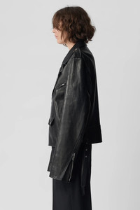 Anu Perfecto - Black - Notched Collar - Epaulettes - Asymetric Zip Closure - Chest Zipped Pocket - Front Press Stud Flap Pocket - Side Buckled Waist Straps - Zipped Cuff Splits - 100% Lamb Leather - Made in Italy Model wears italian size 40 Height: 176 cm Waist: 60 cm Hips 88 cm The fit of this item is oversize. If you prefer a narrow fit, consider purchasing this item 1 size down from your usual size. Care To maintain the beauty and integrity of your purchase, we recommend treating it with care. Simple maintenance practices, such as gentle washing and proper storage, can effectively preserve the longevity of your favorites. We encourage you to refer to the care instructions included with each item, designed to help you keep your purchase in top condition. Design Our dedication to excellence extends beyond materials; it encompasses the artistry and craftsmanship illustrated in every piece we create.