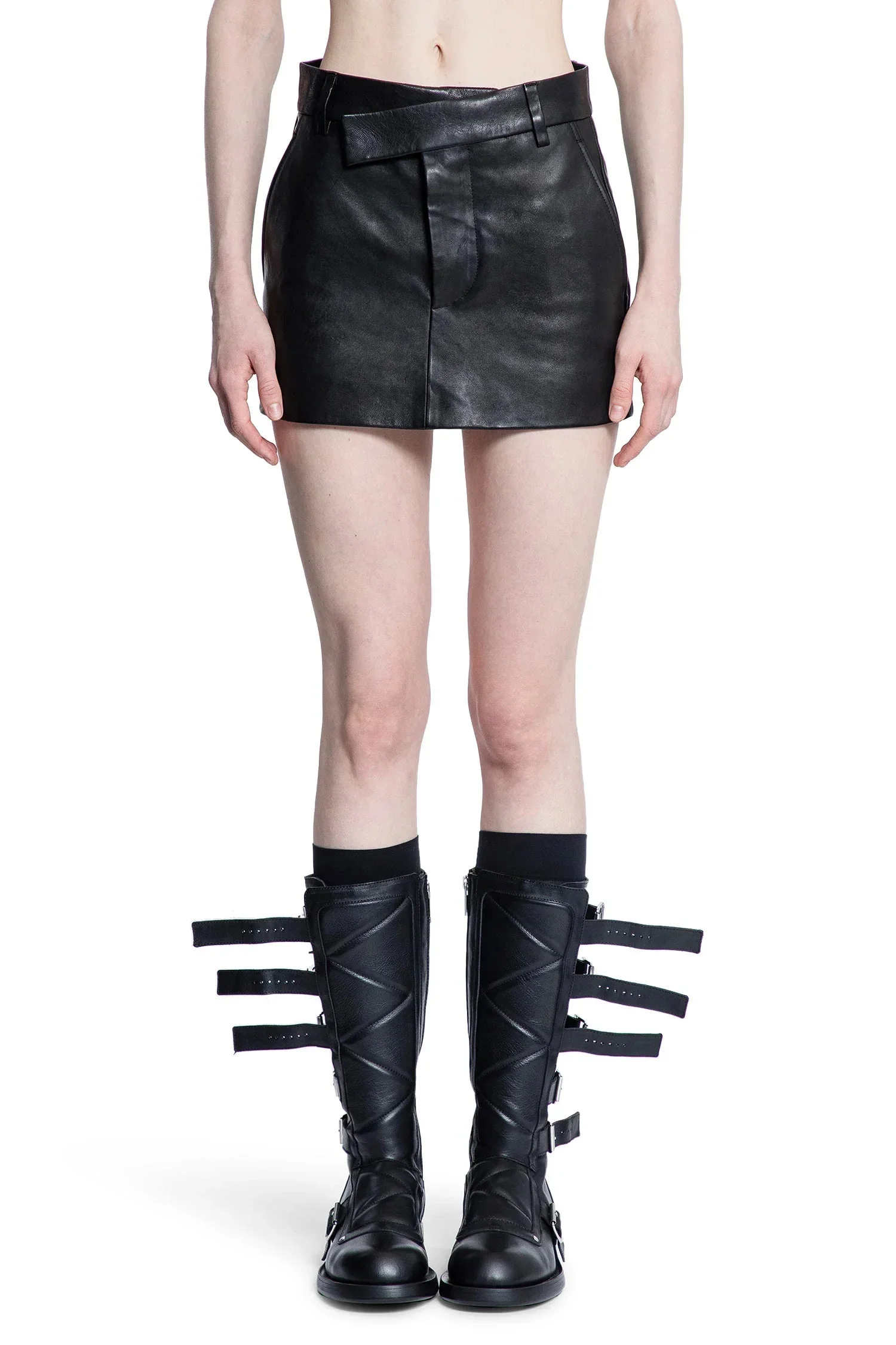 DESCRIPTION - Black - Vintage lux grained leather - Belt holes - Asymmetric hook and zip closure - Side pockets - Asymmetric back pockets - Fitted DETAILS - Made in: Italy - Composition: 100% Lambskin - Model code: B0012266LT137 099 - Item ID: 9232283304278 SIZE & FIT Model wears size 38 Model Height 180 cm Bust 82 cm Waist 58 cm Hips 90 cm
